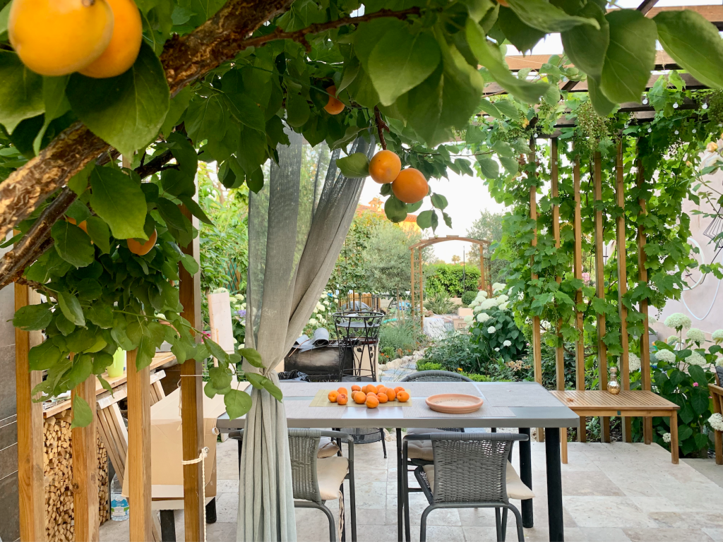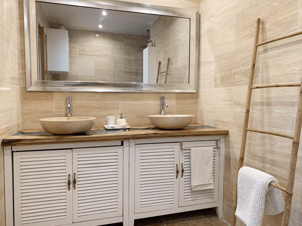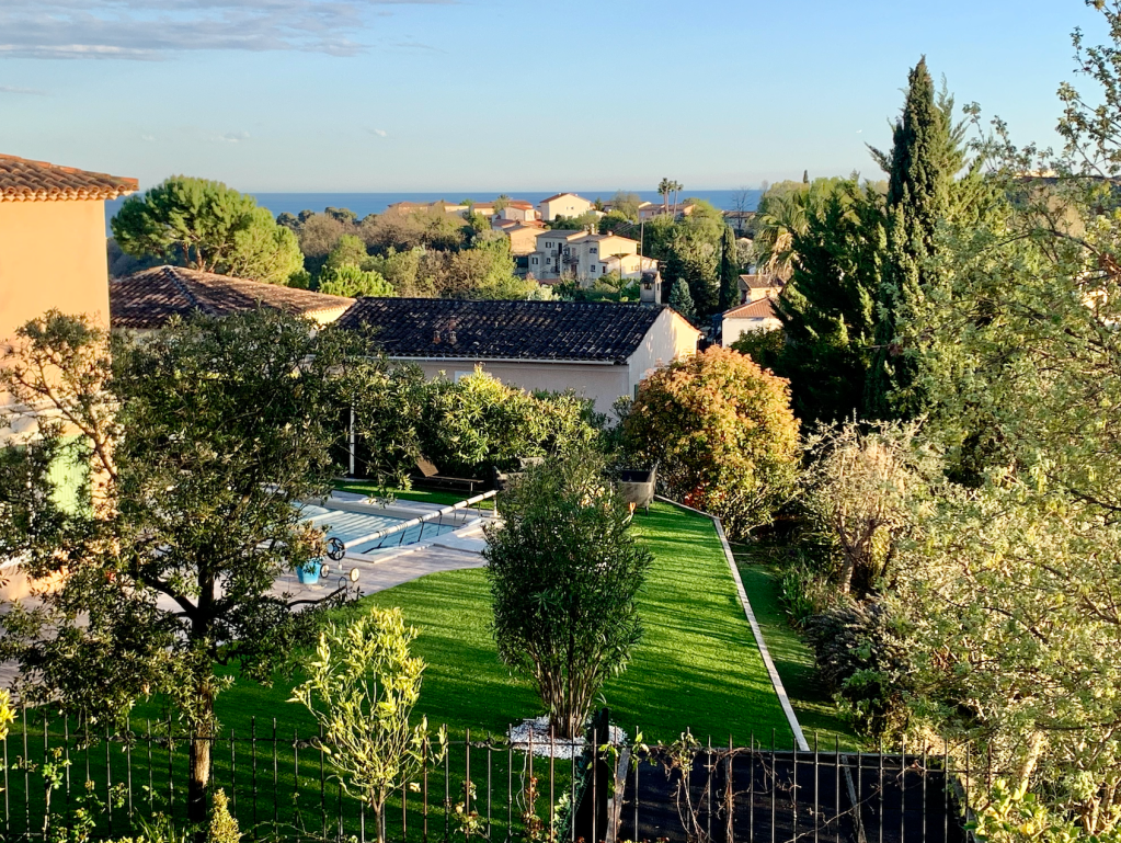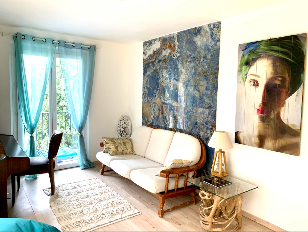 Our villa located on the top level of the house . On the ground floor garages and small studio belonging to voisineLiving room with access to the back garden – outdoor dining room, pool, terraces ”Provençale” bedroom with queen size bed/Chambre ”Provençale” avec le lit kingOutside dinning roomRelaxing area with waterfall wall