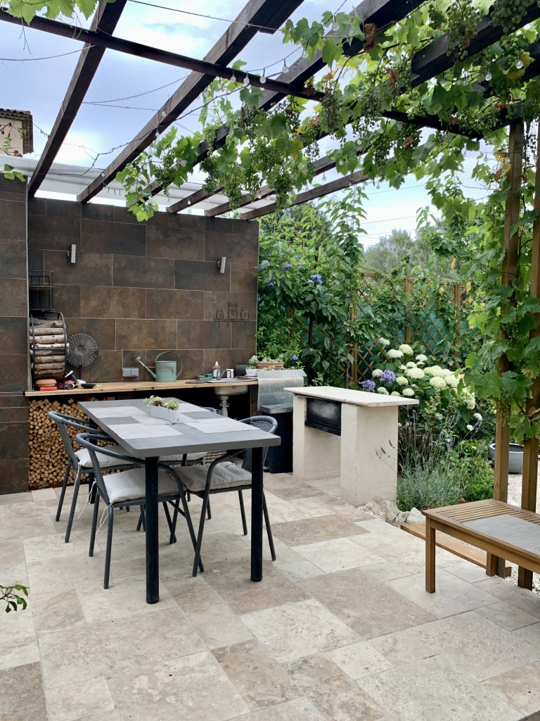 BBQ/outside dining roomFront yard with an additional parking spaceOpen plan living room /sejour “Barcelona'” bedroomKitchenThe sea view from the ‘Oriental ‘bedroom / chambre ”Orientale” Garden roomThe Provence bedroom / Chamber ”Provençal ”